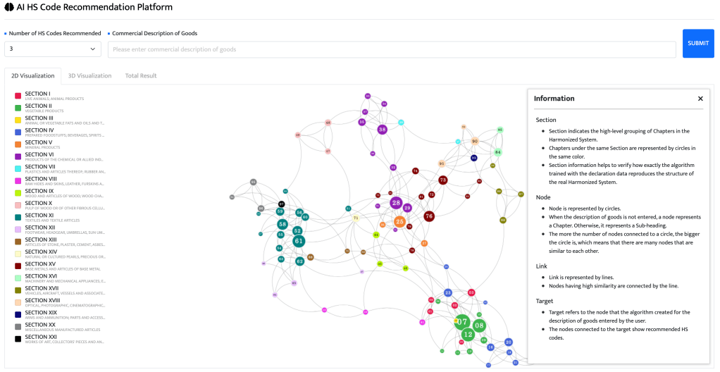An accompanying tool provides a demonstration on the functions which the model offers. Upon entering commercial descriptions into the search bar, the corresponding HS codes and their probabilities are given. You can check the recommendations, the corresponding goods descriptions in the nomenclature and statistics on importers, customs agents and exporting countries. It also visualizes the functions of the model in a two-dimensional and three-dimensional plane, including the relationship between the HS nomenclature chapters and the recommendation results. A summary of the recommendation is also provided in a separate tab to give an overview of the explicit value it provides.